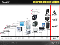このほかShuttleは,[COMPUTEX 2007#05]のレポートでも紹介したとおり,キューブ型ベアボーンおよびPCとなるXPCの新ラインナップを発表した。ゲーマーやパワーユーザーをターゲットとした「XPC Prima」のほか,ホームシアターを意識したAV用途向けの「D’VO」(ディーボ),そしてベーシックタイプとなる「XPC Glamor」の3モデルを,順次市場へ投入していくという。