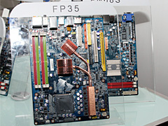左はIntel P35 Express搭載XPC「XPC Prima SP35P3」で搭載されるマザーボード,「FP35」で,ヒートパイプを採用したチップセット&VRMクーラーであるOASISが採用される。右はXPC Primaのカラーバリエーション。標準的な黒色筐体のほか,カラフルなペイントが施されたモデルの投入も検討されている