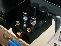 D’VOでは,金メッキされたHDMI端子が用意される(左)。右はD’VO専用というわけではなく,単体製品としても市場展開を目指すという真空管アンプ