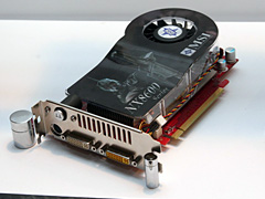 最後にもう一つ,ノートPCですらないが,ブースに展示されていた製品のうち,気になる製品をレポートしておこう。 「NX8600GT Twin Turbo V091」は,I/Oブラケット部にビデオBIOS(VBIOS)を切り替える「Twin Turbo」ボタンが用意され,ハードウェアレベルでオーバークロックBIOSに切り替えることで,GPUやグラフィックスメモリのオーバークロック動作を実現する「GeForce 8600 GT」搭載グラフィックスカードだ。リファレンスクロックであるコア580MHz,メモリ1.6GHz相当で動作するGeForce 8600 GTに対し,オーバークロックBIOSを有効にすると,コアクロック675MHzの「GeForce 8600 GTS」に迫るパフォーマンスにまで,動作クロックを引き上げられるとのことだ。(ライター:本間 文)
