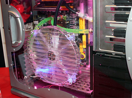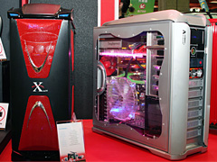 さて,Thermaltakeが同社のブースでさりげなく展示していた対応PCケースは「Xaser VI」「Armor+」。いずれも外観こそ従来モデル(「Xaser III」もしくは「Armor」)と同じだが,内部構造は新しく作り直され,2スロット仕様のハイエンドグラフィックスカード4枚を搭載できるSkulltrailプラットフォームに合わせて,拡張スロット用ブラケットは10本分装備。また,発熱量が増え続けているグラフィックスカードを効率よく冷却するため,ファンの取り付け位置なども工夫されている。