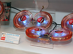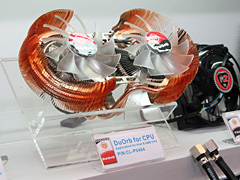 DuOrbシリーズの「DuOrb for CPU」(左)と「DuOrb for VGA」(右)。ヒートパイプとフィンをCPUやGPUの左右に円状に展開し,それぞれにファンを搭載することで,CPUやGPUコアのみならず,メモリチップやVRMなどの周辺回路,マザーボードやグラフィックスカード基板の冷却効率も高めたという