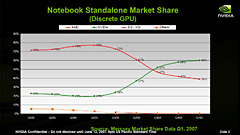 左は,GeForce 8Mの「PureVideo HD」を用いると,高解像度ビデオ再生時のCPU負荷が大幅に下がると謳うスライド。右は,2006年第3四半期をもって,ノートPC向け単体GPU市場のシェアでNVIDIAはAMD(旧ATI Technologies)を抜き去り,業界のリーダーになったとするスライドだ。2007年第1四半期時点では60%のシェアを獲得しているという