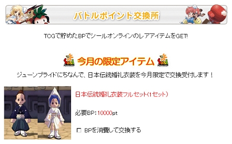 <以下,メーカー発表文の内容をそのまま掲載しています> 株式会社YNK JAPAN(ワイエヌケージャパン東京都中央区、代表取締役:朴?源)の運営するMMORPG(多人数接続型オンラインロールプレイングゲーム)「Seal Online(シールオンライン)」と、株式会社サミーネットワークス(東京都港区、代表取締役社長:大野政昭)の運営するMMORPG「シールオンライン」をテーマにしたPC向けネットワーク対戦型トレーディングカードゲーム(TCG)「シールオンラインTCG」(シールオンラインティーシージー)は、シールオンラインTCGの『BP』と、シールオンラインのレアアイテムを交換できるサービスを開始いたしましたことをお知らせいたします。 シールオンラインTCG・『BP』でのシールオンライン・レアアイテム交換サービス開始概要2007年6月13日より、シールオンラインTCGで対戦するともらえるポイント『BP』と、シールオンラインのレアアイテムを交換できるサービス開始いたしました。 従来、シールオンラインTCGの『BP』は、シールオンラインTCG 『BP交換所』にて、カードデータと交換できるサービスを行っておりましたが、今回より、同じく『BP交換所』に、シールオンラインのレアアイテムが登場し、『BP』を消費して交換できるようになりました。『BP交換所』でしか入手できないアイテムなど、通常では入手困難なアイテムや、ペットのえさ、精錬用のアイテムなど、レアなアイテムを多数用意いたしました。 また、6月中は『日本伝統婚礼衣装』が交換アイテムとして登場します。こういった『超レアアイテム』は毎月違ったアイテムを投入していく予定です。これにより、シールオンライン、シールオンラインTCG双方のユーザーに、双方のサービスをよりお楽しみいただけるようになると考えております。