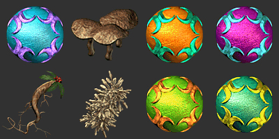 上段左から,ドロップ率上昇丸,マンネン茸,経験値上昇丸,経験値復旧丸