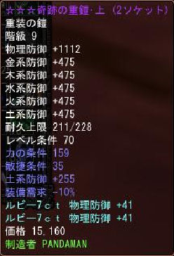 各防具と各階級ごとに、「物理防御と五行防御(金系・木系・水系・火系・土系)の合計値」+「オプション防御値」+「ソケットによるアイテム強化」の合計数値の最も大きい方、1名様。