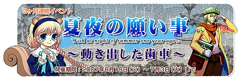株式会社ジークレスト(本社:東京都渋谷区、代表取締役社長:長沢潔)は、無料で遊べるオンラインRPG『トリックスター+』に関して、2007年6月19日(火)にアップデートを行い、3ヶ月連続のイベント第一章【夏夜の願い事 〜動き出した歯車〜】を開催いたします。また、装備する事で取得経験値が通常よりアップする装備アイテム4種類を期間限定で販売いたします。その他魅力的な特典が満載のキャンペーンなどをご用意いたしました。