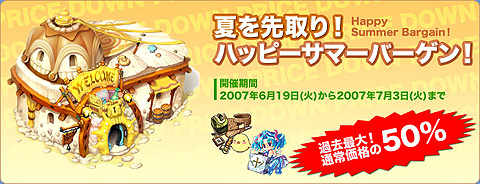 ○内容:期間中に一部のマイショップの販売値が、最大50%での割引販売をいたします。気になっていたアイテムをゲットするチャンス!期間限定での割引ですので、この機会を是非お見逃しなく☆