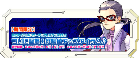 ○販売期間:2007年6月19日(火)定期メンテナンス終了から2007年7月03日(火)定期メンテナンス開始 まで ○内容:装備することでモンスターとの戦闘時などに取得できる経験値が通常よりアップする装備アイテム4種を期間限定で販売いたします。