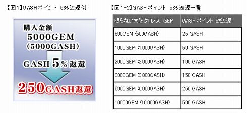 <以下,メーカー発表文の内容をそのまま掲載しています> GASH:『眠らない大陸クロノス』 GASHポイント大放出キャンペーン! 第3弾:GASHでGEMを購入すると5%GASHポイントバックのお知らせ 株式会社ガマニアデジタルエンターテインメント(以下 ガマニア)の課金プラットフォーム「GASH(ギャッシュ)」では、株式会社ゲームオン(以下ゲームオン)が運営するMMORPG (Massively Multi Player Online Role Playing Game) / 多人数参加型オンラインロールプレイングゲーム『眠らない大陸クロノス』において、本日6月20日(水)15時より『GASHポイント大放出キャンペーン!第3弾:GASHでGEMを購入すると5%GASHポイントバック』を開催いたします。 詳しくは以下をご参照ください。 GASHポイント大放出キャンペーン! 第3弾:GASHでGEMを購入すると5%GASHポイントバック