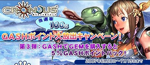 GASHコンテンツ公式WEBサイト(『眠らない大陸クロノス』: [URL])では、5月に引き続き、お得なキャンペーン第3弾を実施いたします。今回のキャンペーンではGASHを使用して『眠らない大陸クロノス』のヴァーチャルマネーGEMを購入すると購入額の5%のGASHポイントが返還されます!皆様のご参加お待ちしております。 第3弾:GASHでGEMを購入すると5%GASHポイントバック ◆キャンペーン概要 ■対 象:キャンペーン期間中にGASHを使用して 『眠らない大陸クロノス』のヴァーチャルマネーGEMを購入した方全員 ■期 間:2007年6月20日(水)15時〜7月19日(木)15時まで ■賞 品:GEMの購入に使用したGASHポイントの5%をプレゼント ■配布方法:7月27日(金)にガマニアからポイントの配布をもって当選とかえさせていただきます。 ※『眠らない大陸クロノス』ゲームオン様公式サイトからの参加はできませんのでご注意ください。 ▽『眠らない大陸クロノス』の新規会員登録はこちら [URL]