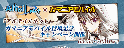 ガマニアモバイル「アルテイルネット登場記念キャンペーン!」のお知らせ 株式会社ガマニアデジタルエンターテインメント(以下 ガマニア)の課金プラットフォーム「GASH(ギャッシュ)」にて配信中の、株式会社デックスエンタテインメント(以下デックス社)が運営するオンラインカードゲームコミュニティ「アルテイルネット」が、7月1日よりガマニアが運営する株式会社エヌ・ティ・ティドコモのi-モード公式サイト「ガマニアモバイル」に登場いたします。これを記念しGASHおよびガマニアモバイルでは「アルテイルネット登場記念キャンペーン」を実施いたします。詳しくは以下をご参照ください。