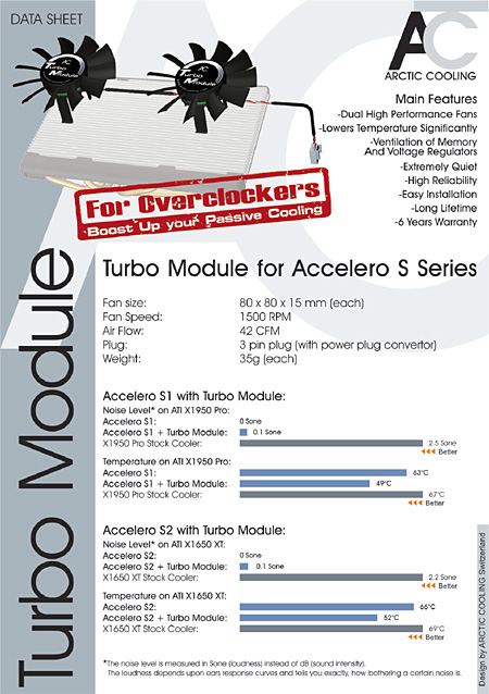 スイスのArctic Coolingは,同社製のファンレスGPUクーラー「Accelero S1」「Accelero S2」専用となる追加2連ファンモジュール「Turbo Module」を発表した。