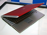 XPS 1330のレッドモデルを別の角度から。光学ドライブはスロットイン仕様となる。HDMI出力をサポートするのも特徴だ