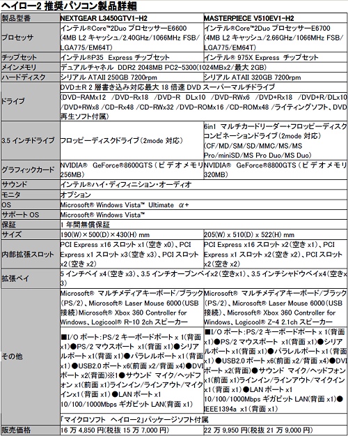 NEXTGEAR L3450GTV1-H2は,CPUにCore 2 Duo E6600/2.4GHz,メインメモリ2GB,HDD 250GB,グラフィックスカードにGeForce 8600 GTSを搭載し,16万4850円(税込)。 MASTERPIECE V510EV1-H2は,CPUにCore 2 Duo E6700/2.66GHz,メインメモリ2GB,HDD 320GB,グラフィックスカードにGeForce 8800 GTSを搭載し,22万9950円(税込)。 両機種とも,OSにはWindows Vista Ultimate α+を採用,マイクロソフト ヘイロー 2のパッケージが付属するほか,ゲームパッドとしてXbox 360 Controller for Windowsが同梱されている。 販売は本日(6月27日)8:00PMからG-Tune公式サイトで受付開始されており,6月28日11:00AMにはり電話通販窓口,各マウスコンピューターダイレクトショップ,G-Tune:Garage(マウスコンピューター秋葉原ダイレクトショップ2F,G-Tune ショップ)で販売を開始する予定だ。(aueki)