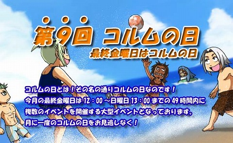 コルムオンラインでは月末の金曜日に『コルムの日』と銘打って、獲得経験値2倍タイム、豪華な賞品が貰えるスタンプラリーや毎回違ったGMイベントなど、初心者の方から上級者の方までが楽しめるイベントを開催しております。また、今回は『サマーボーナスタイム&セール』も併せて開催!