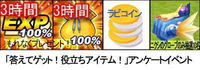 1)アンケート感謝プレゼント紹介 下記アイテムの中からお好きなアイテムを1つプレゼント。 * 祝福された金の文字(3時間) * 祝福された金の福袋(3時間) * ラビコイン3枚 すべてアンケート調査(全3回)にご協力頂いた方の中から、抽選10名様に以下のアクセサリーをプレゼント。 * ニクシのグローブ1個