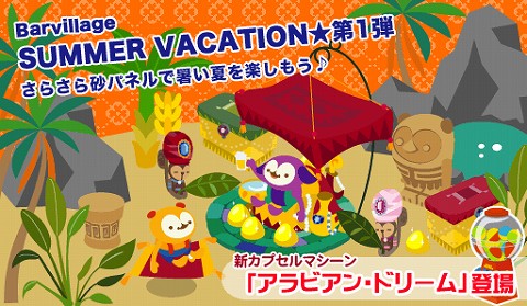■♪夏限定イベント「Barvillage SUMMER VACATION★」  ̄ ̄ ̄ ̄ ̄ ̄ ̄ ̄ ̄ ̄ ̄ ̄ ̄ ̄ ̄ ̄ ̄ ̄ ̄ ̄ ̄ ̄ ̄ ̄ ̄ ̄ ̄ ̄ ̄ ̄ ̄ ○期間 2007年7月4日(水)メンテナンス後〜2007年8月29日(水)メンテナンスまで ○イベント内容 期間中、夏を満喫する様々なイベントを実施します。 各イベントの詳細は「Barvillage SUMMER VACATION★」特設ページで随時公開する予定です。 第一弾では、村のパネルがさらさらの「砂パネル」に変化。海に関連するアイテムが映える様相となりました。 さらに、新カプセルマシーン「アラビアン・ドリーム」が登場しました! 暑さにめげずバルビレッジを満喫してください! ・ 特設ページ