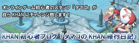 【KHAN初心者ブログ『タマゴのKHAN修行日記』とは?】 1:オンラインゲーム初心者の方向けの「KHAN初心者講座」 でゲームの進め方を詳しく丁寧に解説! 2:「タマゴ」自らKHANをプレイ!「プレイレポート」「新規ダンジョンチャレンジ」 「新着アイテム感想」などなど、様々な情報をお伝えします。 ■オンラインゲーム初心者の方は必見! KHAN初心者ブログ『タマゴのKHAN修行日記』 http://khan-beginnnerblog.paslog.jp/