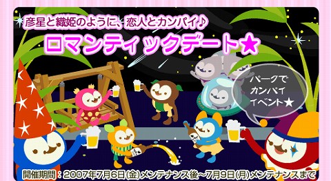 ■♪パーク限定イベント「ロマンティックデート★」  ̄ ̄ ̄ ̄ ̄ ̄ ̄ ̄ ̄ ̄ ̄ ̄ ̄ ̄ ̄ ̄ ̄ ̄ ̄ ̄ ̄ ̄ ̄ ̄ ̄ ̄ ̄ ̄ ̄ ̄ ̄ ○期間 2007年7月6日(金)メンテナンス後〜2007年7月9日(月)メンテナンスまで ○イベント内容 期間中、村とパークのパネルがキラキラのほしぞらパネルにかわり、全てのパークでは、夜空の星たちが彦星と織姫を応援するかのように瞬きます。 さらに、彦星と織姫のように仲良くしていただくため、いずれかのパークで異性のオウルベアとカンパイをした方に、「ワープバルーン」をプレゼントいた します。 ○プレゼント対象 上記開催期間中に、いずれかのパークにて異性のオウルベアとカンパイを行った方全員 ※どのパークでカンパイを行っても対象となります ○プレゼント ワープバルーン5個 ○プレゼント配布日 2007年7月9日(月)予定 ・特設ページ [URL]・「ワープバルーン」とは? ワープバルーンはお友達や、お友達の家に「ワープ」するために必要なアイテムです。  ̄ ̄ ̄ ̄ ̄ ̄ ̄ ̄ ̄ ̄ ̄ ̄ ̄ ̄ ̄ ̄ ̄ ̄ ̄ ̄ ̄ ̄ ̄ ̄ ̄ ̄ ̄ ̄ ̄ ̄ ̄