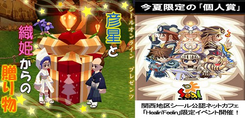 株式会社YNK JAPAN(ワイエヌケージャパン、代表取締役:パク・キウォン)は、当社で運営するMMORPG「Seal Online(シールオンライン)」にて、「彦星と織姫からの贈り物 プレゼント箱を探せ!」七夕スペシャルイベントを開催する共に、関西地区シール公認ネットカフェ「Healin'Feelin」限定、“Road to BEST5 - 今夏の「個人賞」”イベントが共に開催される事をお知らせいたします。