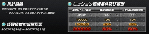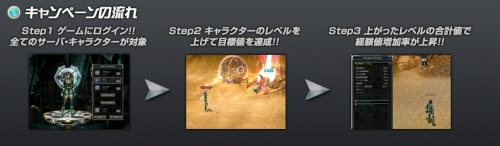 全サーバーの全てのプレイヤーが期間中どれだけレベルを上げたかによって、7月24日(火)メンテナンス終了後から7月31日(火)メンテナンス開始時までの戦闘経験値(経験値増加率/スキル経験値増加率)にボーナスがつきます。 特設ページでは全キャラクター累計レベルアップ値を見ることができますので、こちらを確認しながらレベルを上げてみてください。 参加方法はゲームにログインしてレベルを上げるだけ。 みんなで協力して多くのレベルを上げ、より高いボーナスを手に入れてください。
