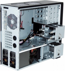 本体サイズは515(高さ)×593(奥行き)×205(幅)ミリ。重さは約19.6kg。利用可能なドライブベイは、5インチ×4、3.5インチ×1、 3.5インチシャドウ×6。拡張スロット×7。搭載電源は1200Wデュアル電源。搭載可能なマザーボード規格はATX/Extended ATX。後部に120mmTriCoolファン×1、上部に140mmTriCoolファン×2、下部に120mmTriCoolファン×1、サイドパネルに200mmBigBoyファンを標準装備。オプションにてフロントに120mmファンを追加可能です。フロントポートはUSB2.0コネクタ×2、Audio in/out×1(HD AudioまたはAC97)、IEEE1394×1を搭載しています。