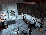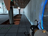 ただし,ポータルはブルー/オレンジ共に一つずつしか設置できず,二つ目の同色ポータルを開いた瞬間に,一つめの同色ポータルは消滅する。しかもポータルは,凹凸のない平坦な場所にしか開けられないのだ。その制限が,Portalのパズル性を高めているのである。慣れてくれば,どの壁が利用できるのかすぐに判断できるようになるので,壁の種類そのものが,パズルを解くヒントとして機能しているように感じた。