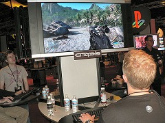 さて,展示されていたのはシングルプレイモードで,海に面した小村を舞台にして敵の歩兵と渡り合うという設定だ。マップは非常に広い印象だが,ハンヴィーを乗り回してあちこち行っても,まったくローディングが発生しない(あるいは発生していても気にならない)のが驚きだ。これがはるか遠くまでを一瞬にして描画できる,野外描写に特化したグラフィックスエンジン,Cry Engine 2の実力なわけだ。 また「Breakable Vegetation System」と呼ばれる機能もチェックできた。これは読んで字のごとく破壊可能な植物という意味だが,手持ちのアサルトライフルや車載の機関銃で木の幹を撃つと,次第に削れてやがて倒れるというものだ。これだけなら見たことがある人もいるだろうが(含筆者),どの木のどこを撃っても,弾の当たった場所から折れて倒れるのは,実際にやってみるとちょっと圧倒される。マップには数百本の木が生えているが,そのすべてが破壊可能なのだ。敵との乱戦になって銃弾が飛び交うと,木は倒れるわ人は倒れるわの大騒ぎになりそうだ。