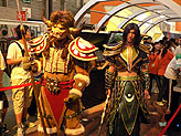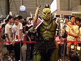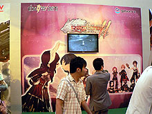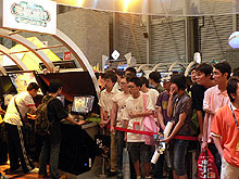 World of Warcraftは言うまでもなく現在も中国で大ヒット中のMMORPG。Hellgate: Londonについては,昨年のChinaJoyレポートでカンファレンスの模様をお伝えしたとおり,中国での期待度も高い作品だ。残る2本は中国で「2006年における2大期待タイトル」と目されていた作品である。 試遊機はタイトルごとに分けられ,かまぼこ型の屋根がかかったスペースに,背中合わせで2台ずつ計4台が用意されていた。World of Warcraftには2スペース計8台が当てられていたのだが,常に待ち行列が生じており,これがPvPの小イベントともなると,すっかり周囲が囲まれてしまう。 ほかの作品についても,試遊機が空いていることはほぼ皆無で,景品配布付きの体験プレイ時間になるや,瞬く間に長蛇の列が出来上がる。開幕後の平日である12日,13日でもそれは同様で,土曜日の14日には試遊機の周辺とブースの横を(通常ここに行列が整理される)中心に,ほぼ通り抜け不能の空間となっていた。