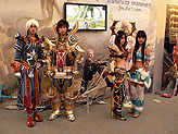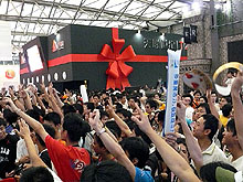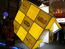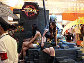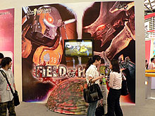 アートワーク/作品ロゴ入りのオブジェのみとなったのが,ダンスゲーム「Audition2」(勁舞団II)とサッカーゲームの「FIFA Online」である。FIFA Onlineのスペースは,フェンスに囲まれて人工芝と小さなサッカーゴールが置かれるのみで,これはブース内イベントのとき以外は機能しないようだ。一方Audition2については,大陸中国および台湾におけるダンスゲーム熱を考えると,大きく注目すべきタイトルなのだが,おそらくはさまざまな事情により,会場にあったのはロゴとアートワークをあしらった円いお立ち台のみ。このお立ち台は,混み合うブース内で貴重な憩いの場として機能していた。