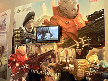 そんなThe9ブースでは,ステージも多くの来場者を集めていた。ゲームキャラクターに扮したコンパニオンさんが壇上に集まり,景品を観客に投げるといった定期的な(?)サービスが行われているときは,広い通路が来場者でいっぱいになって,なかなか通れないくらいだった。 なかでもそれが激しかったのは,13日の午後に行われた,Hellgate: Londonのクローズドβテスト参加権プレゼントのときだ。このときはビル・ローパー氏を筆頭にFlagship Studiosのスタッフが登壇して挨拶したあと,来場者と関係者各人が一対一でダーツ勝負を展開,勝った来場者が10人になるまでそれを続け,10名中上位の5名がβテストの権利を獲得するという趣向になっていた。 ステージ前はほとんど身動きできない混雑ぶりで,1日も早く同作品をプレイしたい来場者達の挙げる手で視界がいっぱいになる。だが,幸運にも司会に選ばれた来場者達の成績は,ダーツがマグネット式だったためか総じて振るわず,ローパー氏が高得点を出すと,それを仔細らしく眺めていた別のスタッフがこっそりと(そして見えるように),隣の低得点エリアに矢を移すといった微笑ましい光景も見られた。
