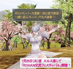 2.「R.O.H.A.N交流フェスティバル」について [ 内容 ] イベントGMの案内によりギルド、結束募集やフレンド、パーティ募集の広場を設置いたします。 [ 開催地 ] エルス港 広場外周付近 [ 日時 ] ・7月25日(水) ・20:00〜21:00 連合1サーバー ・21:00〜22:00 連合2サーバー [注意事項] ・イベントGMは、ゲーム内のご質問及びお問い合わせ等にはお答えできません。 本イベント詳細ページは こちらをご覧下さい。 来週は大型アップデート及びイベント盛りだくさんでユーザーの皆様をお待ちします!