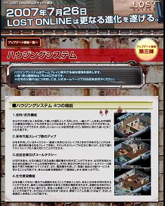 各項目の詳しい説明に関しては、アップデート特設ページ内「ハウジングシステム」の項をご参照下さい。 URL: http://lostonline.mgame.jp/update/update070726/housing-sys.html