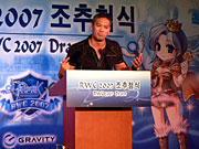 レセプションは,Gravityおよび,「ラグナロクオンライン」(以下,RO)各国パブリッシャ代表からの手短な挨拶で幕を開ける。壇上で景気のよいスピーチを披露したのは,フィリピンとブラジルでROのサービスを提供するLEVEL UP! INTERNATIONALのCOO,Ben Colayco氏だ。 氏は「急に頼まれたので挨拶の内容を考えていなかった」と笑いながら,「2003年からサービスが始まったROは,オンラインゲームというものを世界中に広めた存在である」と,作品全体に関する講評を述べたあと,今大会の話題に入り「フィリピン代表かブラジル代表ギルドの優勝に100米ドルを賭ける」と揚言して,会場を沸かせていた。
