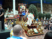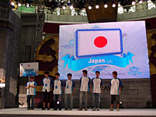 写真上段:開会式前,各ギルドはステージ後ろの待機スペースに集まった。アメリカギルドはなぜか,「招き猫」の置物を持参していた。ぜひ勝利を招いてほしいというところか。その後,各ギルドは順番にステージに現れた