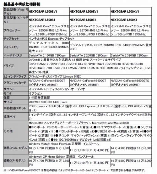 「NEXTGEAR L500SV1」「NEXTGEAR L500S1」は,CPUにCore 2 Duo E6550/2.33GHz,メインメモリにPC2-6400 DDR2 SDRAMを1GB搭載する。グラフィックスカードは,GeForce 8500 GT(グラフィックスメモリ 256MB)搭載製品を採用している。価格は10万4790円(税込)。 「NEXTGEAR L500EV1」「NEXTGEAR L500E1」は,CPUにCore 2 Duo E6750/2.66GHz,メインメモリにPC2-6400 DDR2 SDRAMを2GB搭載。グラフィックスカードは,GeForce 8600 GT(グラフィックスメモリ 256MB)搭載製品となる。価格は11万9910円(税込)だ。 「NEXTGEAR L500XV1」「NEXTGEAR L500X1」は,CPUにCore 2 Duo E6850/3GHzを搭載。メインメモリはPC2-6400 DDR2 SDRAMで,搭載容量は2GBとなる。グラフィックスカードは,GeForce 8600 GTS(グラフィックスメモリ 256MB)搭載製品だ。価格は14万4900円(税込)。