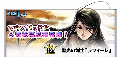 結果発表のお知らせ 株式会社デックスエンタテインメント(本社:東京都世田谷区、代表取締役:黒川文雄)は、現在、サービス中のカードゲームコミュニティ「Alteil.Net」(以下「アルテイルネット」)にて、2007年7月24日(火)マウスパッド化人気投票の投票結果を発表いたします。