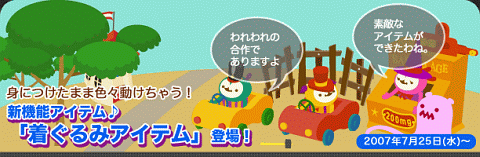 2007年7月25日(水)メンテナンスより、身につけるまま色々な動作ができる新アイテム「着ぐるみアイテム」が登場いたしました。今回登場したラインナップは以下となります。