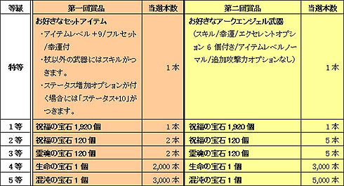 <対象> ヴァーチャルポイント「GEM」(ジェム)の他、プレイチケット、MUGACYAプレイチケットの購入経験者 <内容> ・期間中にモンスターよりドロップする【天空の箱】を入手。 ・【天空の箱】をフィールド上にドラッグすると一定確率で登場するイベントアイテム【レナ】を収集。 ・【レナ】をNPC「黄金のアーチャー」に登録。 ・公式サイト内の宝くじ専用ページにログイン。 ・登録した【レナ】10個につき1回、宝くじを引くことができます。 <宝くじ賞品>