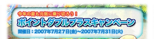 ○『ポイントWプラスキャンペーン』 ○実施期間:2007年7月27日(金)マイページメンテナンス終了 から 2007年7月31日(火)定期メンテナンス開始 まで ○概要 キャンペーン期間中に3,000円以上のポイントを購入すると もれなくサービスポイントが増量します。 [URL]