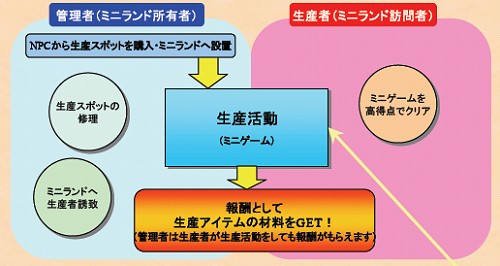 株式会社ジャレコ(本社:東京都新宿区市谷八幡町)では、ほのぼのとした世界観が魅力的なみんなのオンラインRPG『ノーステイル』をサービス中です。この『ノーステイル』の夏の怒涛のアップデートの一環としてミニランドのアイテム生産システムを8月2日(木)14:00に実装します。 【ミニランドアイテム生産システム概要】 ユーザーそれぞれに用意されている箱庭「ミニランド」で、装備品や効果の高い消耗系アイテムを生産するための材料を生産する機能が実装されます。ミニランド内に「生産スポット」を設置し、そこで生産活動(ミニゲーム)を行うことで報酬として材料が手に入る仕組みです。 【ミニランドアイテム生産の流れ】