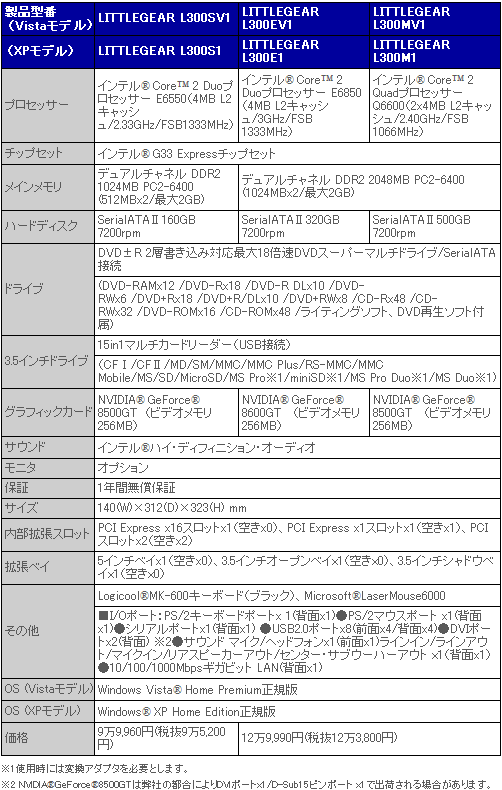 LITTLEGEAR L300SV1/ L300S1(以下型番とOSの対応はVista/XPの順)は,CPUにCore 2 Duo E6550/2.33GHz,メインメモリ1GB,HDD 160GB,グラフィックスカードにGeForce 8500GT/256MBを搭載し,9万9960円(税込)。 LITTLEGEAR L300EV1/ L300E1は,CPUにCore 2 Duo E6850/3GHz,メインメモリ2GB,HDD 320GB,グラフィックスカードにGeForce 8600GT/256MBを搭載し,12万9990円(税込)。 LITTLEGEAR L300MV1/ L300M1は,CPUにCore 2 Quad Q6600/2.40GHz,メインメモリ2GB,HDD 500GB,グラフィックスカードにGeForce 8500GT/256MBを搭載し,12万9990円(税込)。