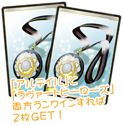 【開催期間】 2007年8月1日(水)〜8月31日(金) 【開催内容】 2007年8月度(9月3日発表予定)の「アルテイル」ランキング並びに「ラヴァートヒーローズ」ランキングにて、入賞(100位以内にランクイン)した全員に、カード「ラヴァートメダル」をプレゼント! 【対象者】 ・「アルテイル」8月度月間ランキング100位以内の方 ・「ラヴァートヒーローズ」8月度月間ランキング100位以内の方 【賞品内容】 カード「ラヴァートメダル」1枚 【追加日予定日】 2007年9月10日(月)12:00(予定) ■「ボクの夏テイル」特設ページはこちら! [URL]■ラヴァートメダルカードとは? 大会やイベント等に参加し、一定の条件をクリアすると得られるカード。 戦闘能力はまったくないが、カードを集めることにより好きなGMカードやグッズと交換することができるイベントカード。 その他イベントカードについてはこちら!! [URL]