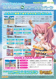 キャンペーン期間中、対象ゲームへの公認ネットカフェからの接続時間に応じて、ゲームプレイで活躍する便利なゲーム内アイテムや夏らしいイベントアイテムをもれなくプレゼントいたします。