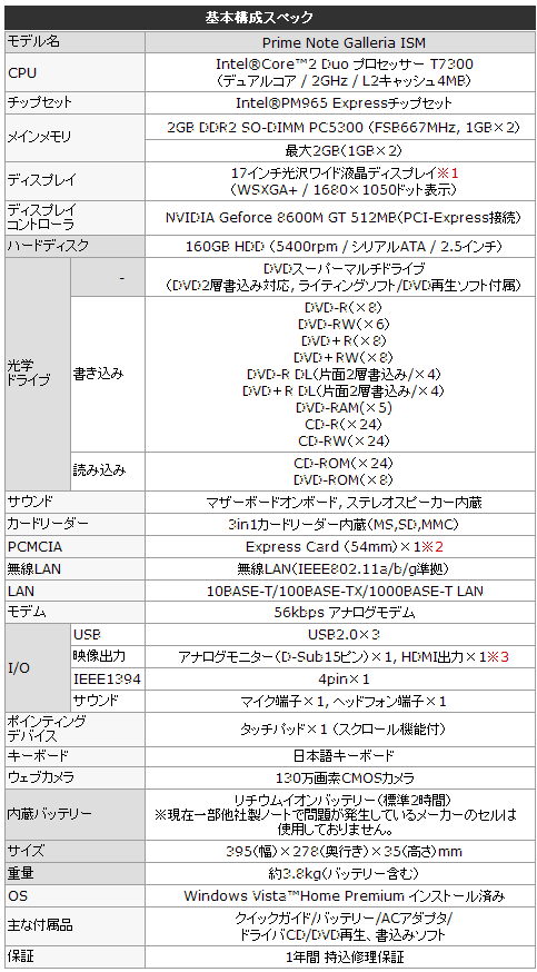 Prime Note Galleria ISMは,Core 2 Duo T7300/2GHz,メインメモリ2GB,ターボメモリ1GB,HDD 160GB,グラフィックスチップにGeForce 8600M GT,1680×1050ドット表示の17インチ光沢ワイド液晶を搭載し,19万9980円(税込)。搭載OSはWindows Vista Home Premiumである(Windows XP非対応)。