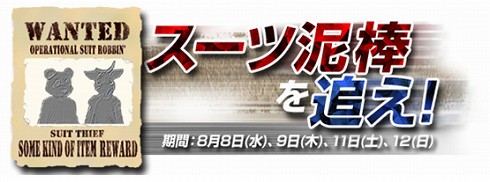 冒険者達は、スタミナ1000の製造でおなじみの「ニャン製薬」から盗まれた作業用スーツを、フィールド上を逃げ回っているスーツ泥棒から取り返すイベントです。捕獲が成功すると、捕獲をしたユーザーに報酬と、さらに捕獲していない全ユーザーにも、スペシャルアイテムをゲットできるチャンスが到来します。
