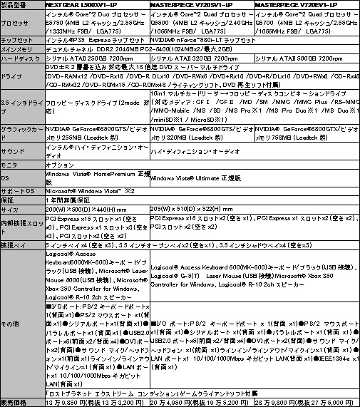 は,CPUにCore 2 Quad Q6700/2.66GHz,メインメモリ2GB,HDD 500GB,グラフィックスカードにGeForce 8800 GTX/768MB,OSにWindows Vista Ultimateを搭載して,28万9800円(税込)となっている。