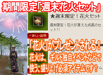 名づけて「週末花火セット」♪ セットの中に花火は含まれておりませんが、期間限定「週末花火セット」を購入したすべての方に、もれなく花火1セット(100個※次週水曜定期メンテナンス時支給)がプレゼントされます