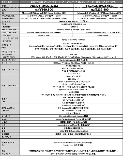 FRCA-Z7I860GTX/SLIは,CPUにCore 2 Duo E6550/2.33GHz,メインメモリ1GB,HDD 320GB,グラフィックスカードにGeForce 8600 GT×2を搭載し,16万9800円(税込)。 FRCA-Z8I880GSX/SLIは,CPUにCore 2 Quad Q6600/2.40GHz,メインメモリ1GB,HDD 320GB,グラフィックスカードにグラフィックスメモリ320MB版のGeForce 8800 GTS×2を搭載し,23万9800円(税込)。